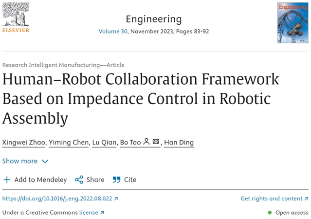 引用信息:Xingwei Zhao, Yiming Chen, Lu Qian, Bo Tao, Han Ding. Human-Robot Collaboration Framework Based on Impedance Control in Robotic Assembly. Engineering, 2023, 30(11): 83–92