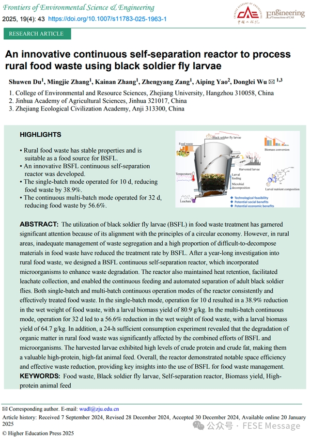 本文内容来自FESE期刊2025年第19卷第4期发表的研究文章“An innovative continuous self-separation reactor to process rural food waste using black soldier fly larvae”。通讯作者为浙江大学的吴东雷研究员。
