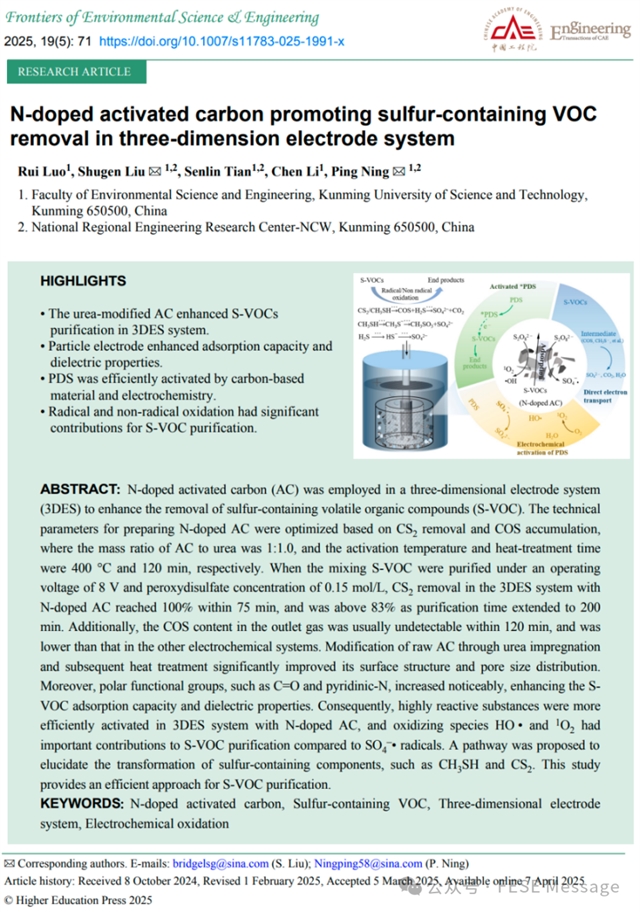 本文内容来自FESE期刊2025年第19卷第5期发表的研究文章“N-doped activated carbon promoting sulfur-containing VOC removal in three-dimension electrode system”。通讯作者为昆明理工大学的刘树根教授和宁平教授。