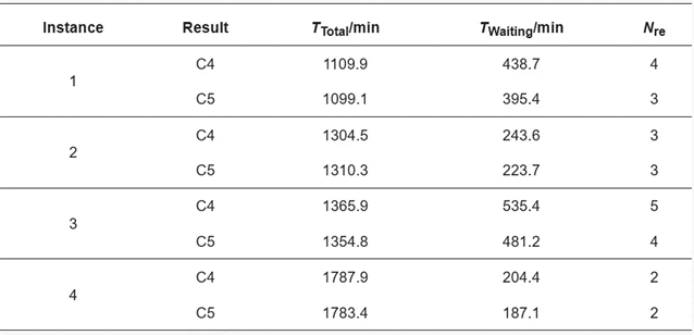 通过该仿真模型对启发式算法 (C4) 和基于“炉-机对应”模式优化启发式算法 (C5) 所求解的调度方案进行了对比分析,仿真结果如下表1所示,在“炉-机对应”模式优化后,调度方案的加权计划总完成时间TTotal相比未优化前减少了8.7 min,加权炉次传搁等待时间TWaiting较优化前减少了45.5 min,重调度次数Nre减少。由于“炉-机对应”的生产模式优化是从实际生产中总结出来的工序衔接匹配模式,因此,经过“炉-机对应”模式优化后的调度方案在各炉次工序/设备指派时减少了指派随机性,不同设备之间的明确对应关系可保证铁素物质流的顺畅运行,从而减少实际生产环境下炉次的总完成时间和传搁等待时间。