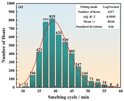 图1. 转炉冶炼周期与炉次重量统计结果:(a) 转炉冶炼周期分布;(b) 炉次重量分布。