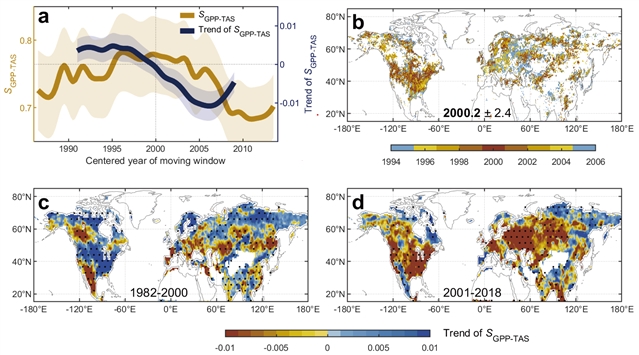 研究发现,北半球增温显著提升生态系统固碳能力,但2000年前后生态系统固碳能力对温度敏感性的趋势发生了由正向负的逆转,这意味着增温对固碳能力的促进作用正在逐渐减弱(图1)。