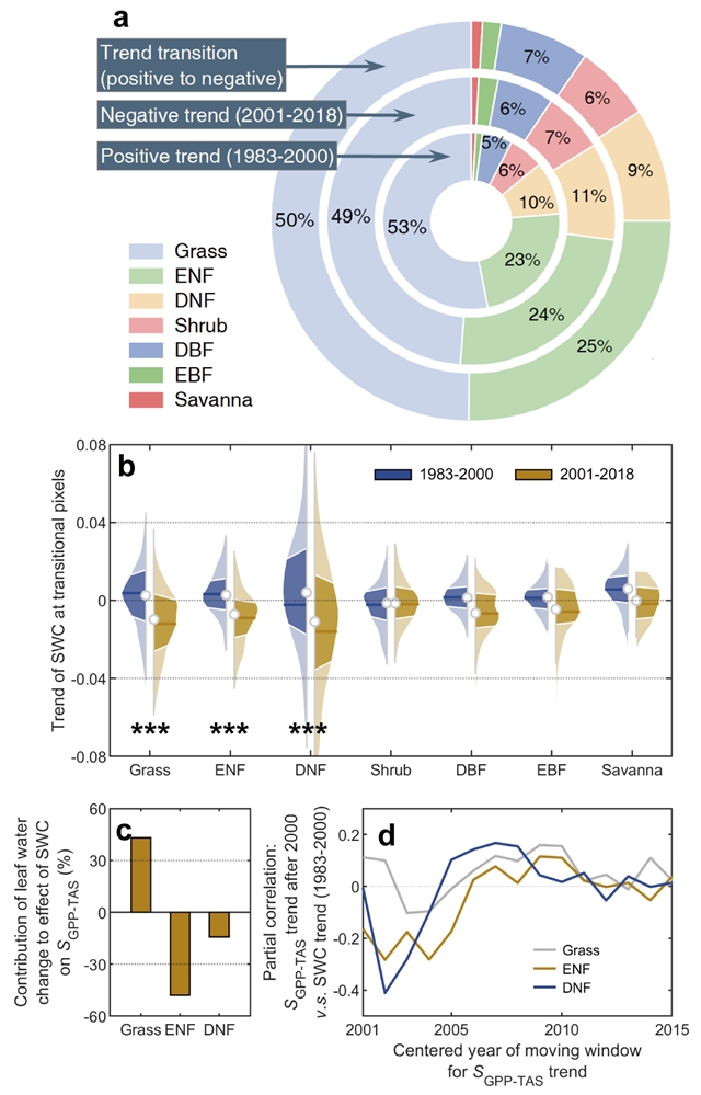 深入分析表明,土壤可利用性水分下降是这一现象的关键驱动因素(图2)。上述敏感性趋势逆转主要发生在草地和针叶林,两者应对干旱的生理策略截然不同:草地采用“非等水型”策略,干旱时仍保持气孔开放以短暂维持气体交换,由此加速叶片水分流失,放大了干旱对温度敏感性的削弱作用;针叶林采用“等水型”策略,干旱时关闭气孔缓冲即时水分损失。然而后者存在显著的负遗留效应,即在1983–2000年的相对湿润期,针叶林快速生长过度消耗深层土壤水分,增加了系统应对后续干旱事件的脆弱性。模型预测结果显示,21世纪中后期北半球陆地生态系统固碳能力的温度敏感性将持续下降,高排放情景下土壤干旱加剧,敏感性降低现象更为显著。