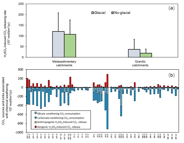 在活跃的构造运动和最广泛的低纬冰川分布共同控制下,青藏高原及其周边区域成为世界上风化最活跃和硫化物氧化产酸最强烈的热点区域之一。目前,高原隆升对大陆硅酸盐岩和碳酸盐岩风化作用的影响,以及青藏高原风化碳效应受到硫化物氧化产酸的干扰程度尚未量化,主控因素尚未明确,制约了我们对造山运动与全球碳循环,乃至气候变化之间关系的认识和理解。针对这一问题,中国科学院地质与地球物理研究所徐志方研究员团队,在青藏高原不同气候背景的单一岩性小流域和大型江河流域设计了系统的河水样品采集和分析工作,应用河流元素和同位素(碳同位素、硫酸根硫氧同位素、锶同位素等)地球化学手段,开展了河水溶质、无机碳、硫酸根等水化学物质的定量溯源,取得了硅酸盐岩和碳酸盐岩在不同酸性侵蚀剂作用路径下的风化物质贡献量,以及不同背景流域岩石风化速率和净碳源汇通量的估算工作。研究发现,硫化物氧化是高原大河流域硫酸根的重要来源,占比范围在25%~92%。高原原生态大河怒江流域,河水90%以上的硫酸根来自硫化物氧化(Liu et al. 2023a),即便在蒸发盐广布的高原北部流域,其平均贡献也达到了~38%(Xu et al., 2024),表明硫化物氧化产酸广泛参与了高原岩石风化过程。