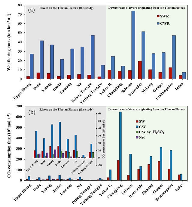 图3 发源于青藏高原主要河流流域风化速率与二氧化碳消耗通量的上下游对比(下游河流数据参考文献见Liu et al. 2025)