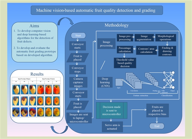 本研究表明,使用图像处理和CNN模型都是进行水果分级的有效方法。图像处理算法对芒果和番茄的检测准确率分别为89%和92%。所提出的CNN架构对芒果和番茄的相对准确率更高,分别为95%和93.5%。整个系统 (包括缺陷水果检测和水果机械分级) 成功运行。与现有系统相比,所开发的自动缺陷水果检测和分级系统相对更便宜、可靠、快速、无错误且准确。
