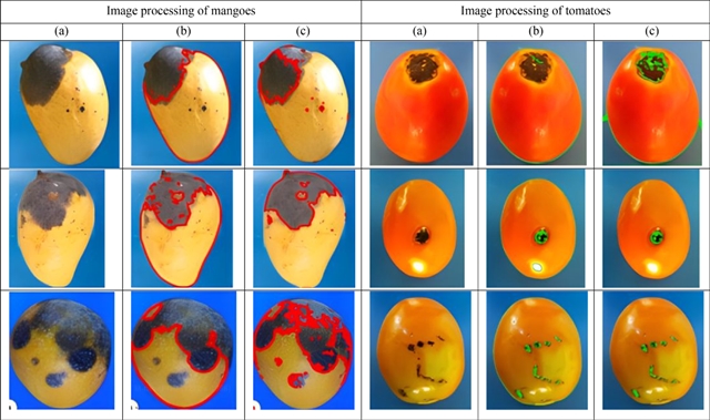 图3 图像处理算法方案各步骤示例,每行展示三种不同的芒果和番茄样本:(a) 原始样本;(b) 围绕新鲜部分的轮廓;(c) 围绕缺陷部分的轮廓。