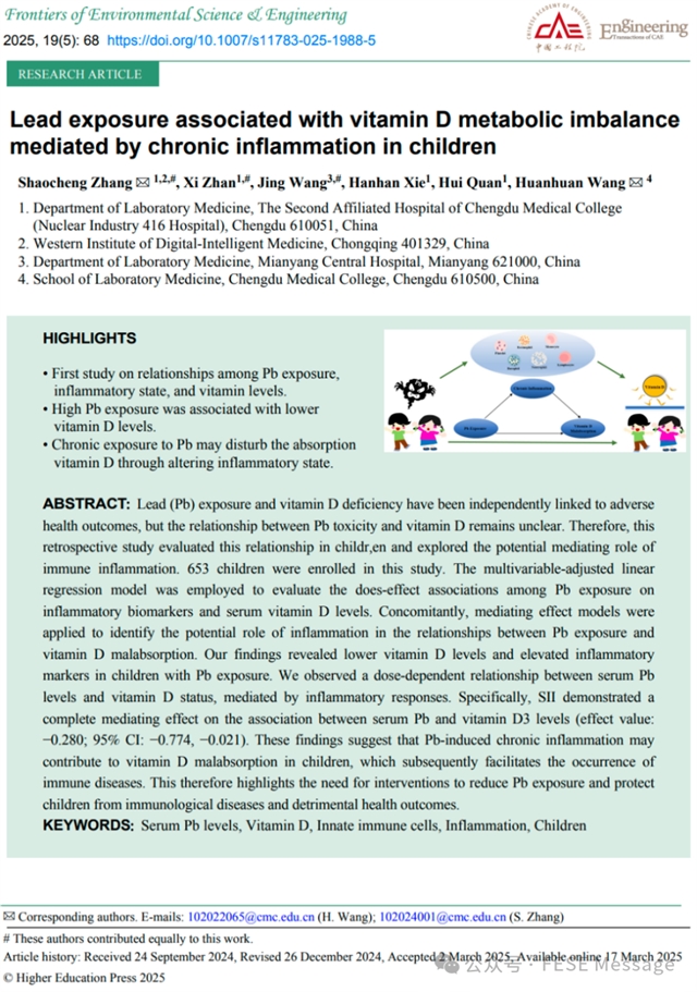 本文内容来自FESE期刊2025年第19卷第5期发表的研究文章“Lead exposure associated with vitamin D metabolic imbalance mediated by chronic inflammation in children”。通讯作者为成都医学院第二附属医院的Shaocheng Zhang和成都医学院的Huanhuan Wang。