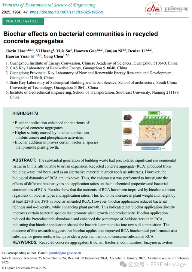 本文内容来自FESE期刊2025年第19卷第4期发表的研究文章“Biochar effects on bacterial communities in recycled concrete aggregates”。通讯作者为中国科学院的袁浩然研究员。