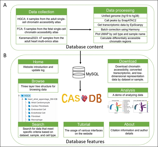 研究的重点对象。深入理解心脏的发育过程、生理功能及疾病机制,对于心血管疾病的诊断、治疗和预防具有重要意义。在此背景下,研究心脏的染色质可及性对于揭示其表观遗传特征、解析细胞类型特异性的调控网络以及发现潜在治疗靶点至关重要。近年来,随着单细胞测序技术的发展,已有多项关于人类心脏单细胞染色质可及性的数据被发表。然而,这些数据存在来源分散、数据混杂、基因组版本不统一及批次效应等问题,制约了其深入利用。因此,亟需构建一个大规模、高质量、统一标准的人类心脏单细胞染色质可及性数据库,以支持系统性的表观遗传与基因调控研究。