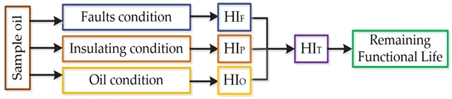 电力变压器剩余寿命评估的核心在于其纸油混合绝缘系统。过去的研究通常通过固体绝缘状态来评估电力变压器的寿命,而一些研究者则提出了多参数评估法来确定剩余寿命。近年来,纸油绝缘系统已成为诊断电力变压器健康状况及估算其使用寿命的关键技术发展方向。也有多项研究表明变压器的健康指数 (HI) 能够为用户提供可靠的决策依据。因此,本文提出了一种基于多参数分析的变压器健康状态评估模型。该模型通过对变压器纸油绝缘系统的多参数分析,获取变压器的健康指数 (HI),进而根据健康状态评估电力变压器的剩余使用寿命。