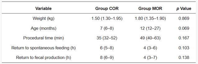 表1. 睾丸切除术后,皮下注射卡洛芬 (COR) 或美洛昔康 (MOR) 治疗的兔子在体重、年龄、手术时间、恢复自主进食和排便时间方面的差异。结果以中位数 (四分位距,IQR) 报告。