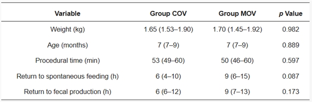 表2. 卵巢切除术后,皮下注射卡洛芬 (COV) 或美洛昔康 (MOV) 治疗的兔子在体重、年龄、手术时间、恢复自主进食和排便时间方面的差异。结果以中位数 (四分位距,IQR) 报告。