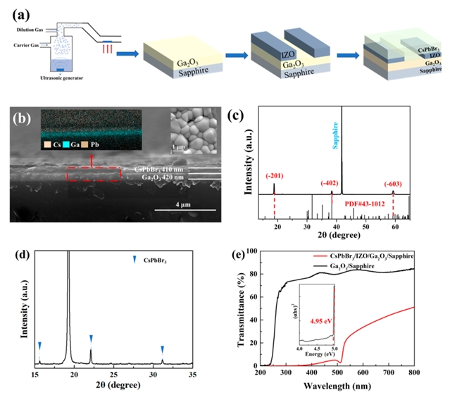 (a) 光电探测器的制备过程。(b) CsPbBr3/Ga2O3/蓝宝石薄膜的扫描电子显微镜(SEM) 图像。插图分别为横截面的能量色散X射线谱 (EDX) 和表面的SEM图像。(c,d) CsPbBr3/Ga2O3/蓝宝石薄膜的X射线衍射 (XRD) 光谱。(e) β-Ga2O3薄膜及Ga2O3/IZO/CsPbBr3在蓝宝石上的紫外-可见透射光谱;插图为 (αhν)2与光子能量的关系图。