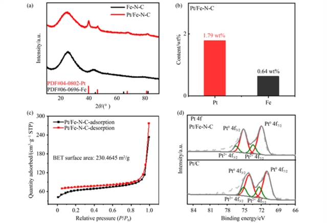 物理表征显示,Pt/Fe-N-C呈直径40–70 nm的纳米棒结构,铂颗粒均匀分散于载体表面,晶格间距0.222 nm对应Pt(111)晶面。X射线衍射(XRD)与X射线光电子能谱(XPS)分析表明,铂主要以零价态存在,且Pt 4f结合能较Pt/C正移1.0 eV,证实Fe向Pt的电子转移优化了表面电子结构。电感耦合等离子体(ICP)测试显示催化剂中Pt和Fe含量分别为1.79 wt%和0.64 wt%,比表面积及孔径分析(BET)表明其比表面积达230.46 m²/g,为活性位点暴露提供了充足的界面。