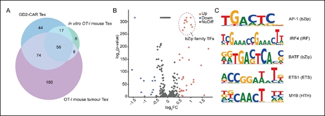 研究团队在小鼠和人类的T细胞耗竭模型中鉴定出56个保守的转录因子结合基序。火山图分析显示,bZIP家族转录因子(如JunB、Fosl2和BATF)在耗竭T细胞中显著富集。这些基序的序列特征分析揭示了不同转录因子家族(如bZIP、IRF、ETS和HTH)的特异性结合模式,为合成启动子的设计提供了关键元件。