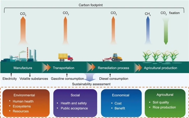 联合国17项可持续发展目标(SDG)中,多个目标相互联系,尤其是SDG 2:“消除饥饿、实现粮食安全和改善营养、促进可持续农业”和SDG 11:“应对气候变化”,充分考虑了农业、能源与气候变化之间的协同和平衡。因此,FAO为了给各国政府官员和其他利益相关者提供一套框架指引,于2020年制定了可持续土壤管理(SSM)评估协议,提供了评估土壤功能关键指标的多个实用条款[19]。该协议代表了一种新的转变,即在整个修复过程中使环境、社会、农业和经济效益最大化。基于这一准则,我们前期研究证实了生物质炭对稻田土壤修复的可持续性明显优于石灰质,可实现土壤质量改善和水稻安全生产双重目标的协同[15]。但仅依据成本或效率的单一评估体系往往得到相反的结论,这是忽略了生产/开发和运输过程的负面环境等影响所导致的。此外,土壤修复过程的碳足迹分析是可持续性评估的重要补充,必须与其相结合应用(图2),从而实现碳减排(SDG 11)与粮食生产(SDG 2)的可持续目标的协同。因此,建立全生命周期农田土壤修复可持续性评估框架是至关重要的,可为政府监管、市场管理、技术选择决策提供重要参考。