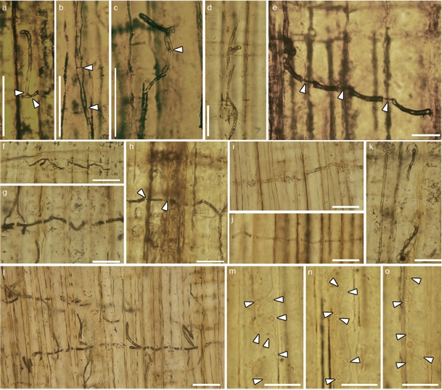 图2 辽西侏罗纪发现的蓝变真菌菌丝化石(a-c. 具横隔壁的真菌菌丝;d. 穿过交叉场的分叉的菌丝;e- j. 木材径切面,示横穿管胞壁的菌丝,箭头指示典型的“穿透钉”结构;k. 穿过管胞径壁纹孔的菌丝;b-c. 横切面扭曲的生长轮;d-e. 木材径切面管胞径壁纹孔;l. 木材弦切面,示横穿管胞壁的菌丝;m-o. 箭头示菌丝上着生的疑似厚垣孢子)