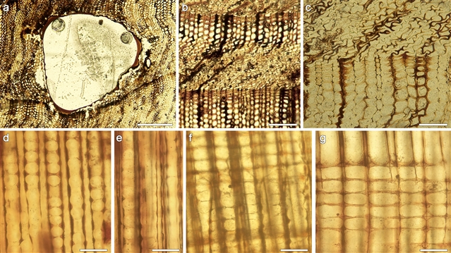 图1 辽西侏罗纪蓝变真菌宿主木材化石解剖特征(a. 木材蛀孔;b-c. 木材横切面,示扭曲的生长轮;d-e. 木材径切面,示管胞径壁纹孔;f-g. 木材径切面,示窗格型交叉场纹孔)