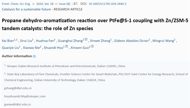 论文标题:Propane dehydro-aromatization reaction over PtFe@S-1 coupling with Zn/ZSM-5 tandem catalysts: the role of Zn species