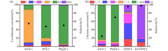 图2 (a)环己烯和(b)1-己烯在不同催化剂上的转化反应中所表现出的催化性能