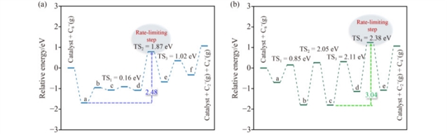 图3 1-己烯裂解生成C2和C4烯烃在(a)ZSM-5和(b)Zn/ZSM-5催化剂上的最优反应能量图