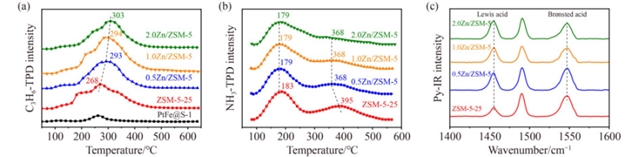 图4 ZSM-5-25以及不同的xZn/ZSM-5样品的丙烯程序升温脱附(C3H6-TPD)图谱,(b)氨气程序升温脱附(NH3-TPD)图谱和(c)吡啶红外(Py-IR)光谱图