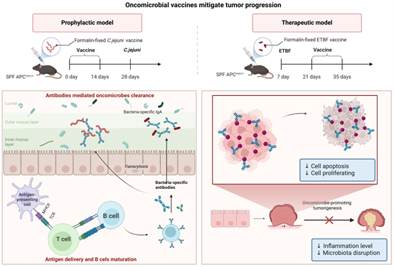 本研究旨在验证利用微生物疫苗预防或治疗与致癌微生物相关的CRC的概念。研究人员建立了两种动物模型:预防模型和治疗模型,分别使用空肠弯曲杆菌(C. jejuni)和产肠毒素脆弱拟杆菌(ETBF)作为研究对象来进行概念验证。