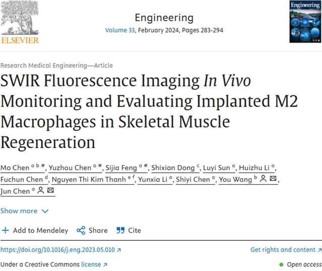 Mo Chen, Yuzhou Chen, Sijia Feng, Shixian Dong, Luyi Sun, Huizhu Li, Fuchun Chen, Nguyen Thi Kim Thanh, Yunxia Li, Shiyi Chen, You Wang, Jun Chen. SWIR Fluorescence Imaging In Vivo Monitoring and Evaluating Implanted M2 Macrophages in Skeletal Muscle Regeneration. Engineering, 2024, 33(2): 283–294