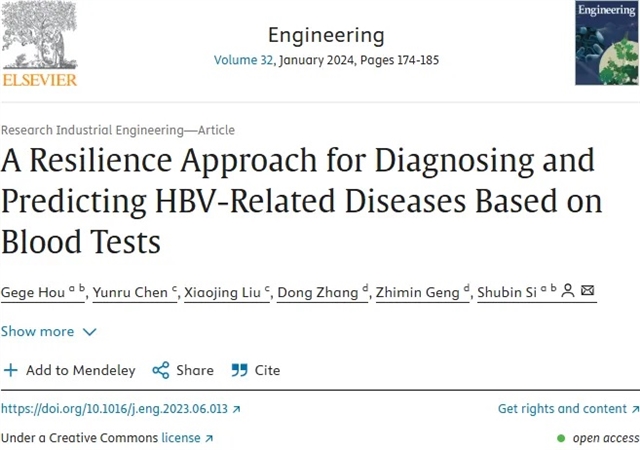 西北工业大学司书宾研究团队在中国工程院院刊《Engineering》2024年1月刊发表题为“A Resilience Approach for Diagnosing and Predicting HBV-Related Diseases Based on Blood Tests”(一种基于血液检测的诊断和预测HBV相关疾病的弹性方法)的研究性论文,指出乙肝病毒(HBV)感染威胁着全球公共卫生安全,是导致肝脏相关疾病发病率和死亡率的主要原因。HBV持续感染引起的肝脏疾病检查方法包括实验室检测、超声、CT、核磁共振和肝活检等,重复的检查和多次诊断可能导致患者每次就医都面临高额费用。因此,迫切需要建立一种经济有效的诊断方法简化乙肝相关疾病的医疗流程。基于临床血液检测,文章构建复杂网络模型并定义功能恢复力评价指标,可以帮助医生评估患者的肝脏状况。其次,通过结合网络模型和动力学,发现导致患者向肝硬化或肝癌转化的关键血液指标及其相应的阈值,为进一步研究疾病临界状态和预防疾病恶化提供思路。结果表明,功能恢复力的诊断宏观平均精度为84.74%,而在没有影像或活检辅助的情况下医生凭经验诊断的宏观平均精度为55.64%。从经济角度,与一般诊断方法相比,功能恢复力可以为大多数中国患者每次就诊节省至少30美元,为大多数美国患者节省至少400美元。在全球范围内,每年将节省至少105亿美元。因此,功能恢复力可以全面评估患者的肝脏状况,减少影像学检查的次数,避免肝病诊断过程中医疗资源的浪费。
