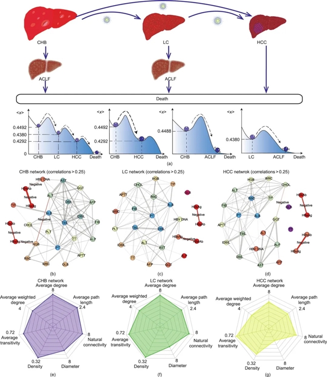 图1.慢性乙型肝炎、肝硬化和肝细胞癌的疾病发展和网络结构