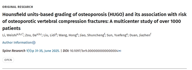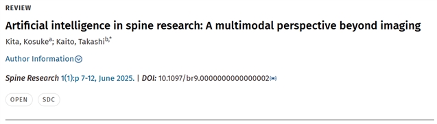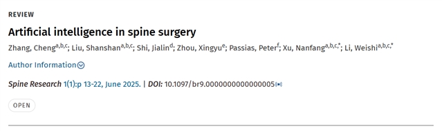 Spine Research 期刊于2025年6月正式创刊!首期聚焦人工智能在脊柱领域的发展,共收录6篇文章,包含2篇社论(Editorial),3篇综述(Review),1篇研究论文(Research Article)。全部文章均为开放获取(Open Access),供全球读者免费阅读!欢迎登录期刊主页,浏览期刊全文:https://journals.lww.com/spres/pages/issuelist.aspx