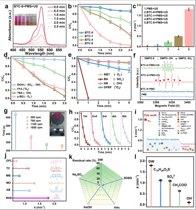 在超声作用下,BTC-8能够有效活化PMS,并在2.5分钟内完全降解罗丹明B溶液,其反应速率常数是BTC-0的29.93倍。淬灭实验和自由基探针实验证实,·SO4-和1O2是体系中的主要活性物种,而EPR结果表明DMPO被·SO4-氧化是DMPO-X加合物产生的原因。此外,实验还发现,BTC-8 在温和的机械刺激(例如磁力搅拌)下同样表现出突出的压电催化性能,提升搅拌速度能缩短降解时间,且BTC-8具有优异的稳定性和可重复使用性。针对多种不同类型污染物和实际水体环境中的降解测试结果也证实了BTC-8良好的水体修复应用前景。
