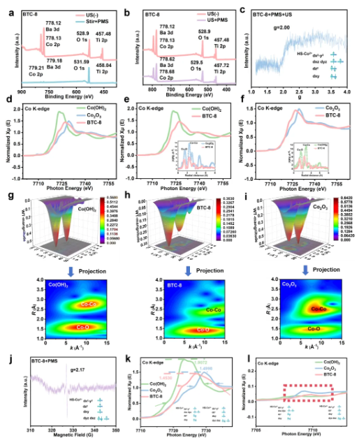 (a) 搅拌下全 XPS 光谱;(b) 超声下全 XPS 光谱;(c) BTC-8经PMS和超声处理的EPR 波谱: (d-f) 归一化X 射线吸收光谱 (XAS);(g-i) 小波变换扩展 X 射线吸收精细结构光谱 (WT-EXAFS);(j) BTC-8经PMS处理的EPR 波谱;XAS光谱中的 (k) 白线峰和 (l) 边前峰。