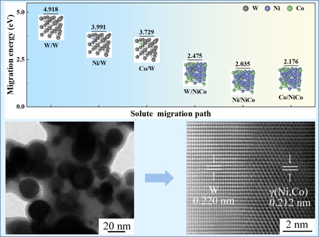 为探究初始烧结阶段的物质传输路径,对形成的烧结颈进行了成分分析。元素面扫结果显示核壳结构粉体形成的烧结颈中镍钴元素均匀分布,这源于低熔点粘结相率先引发的烧结,然而均匀结构粉体烧结颈处则观察到镍钴富集的现象。该结果表明,均匀结构颗粒中镍钴相需首先从钨基体中析出后方能形成连接颗粒的颈部,此过程显著区别于核壳颗粒的元素扩散。迁移能计算表明钨、镍、钴原子最有利的传输路径是经由γ-(Ni,Co)相扩散,而核壳结构复合粉体中由于镍钴在钨纳米颗粒表面的定向偏聚,更有利于物质的快速扩散。对于均匀结构的粉体颗粒,烧结启动依赖于Ni、Co原子通过钨空位迁移至颗粒表面。该过程的能垒虽低于钨自扩散能垒,但仍显著高于各原子在γ相中的迁移能,合理解释了均匀粉体需要更高起始烧结温度的原因,也证实了粉体构型对元素扩散路径及致密化的调控作用。