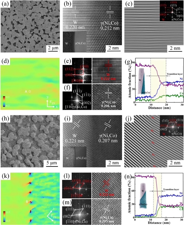 图4 (a)核壳结构粉体烧结合金的SEM图像,(b)相界面的HAADF-STEM图像,(c)FFT反FFT图谱,(d)几何相位应力分析,(e) W晶粒内部的TEM及FFT图谱,(f)远离界面区的粘结相TEM及FFT图谱,(g)APT界面成分分布分析;(h)均匀结构粉体烧结合金的SEM图像,(i)相界面的HAADF-STEM图像,(j)FFT反FFT图谱,(k)几何相位应力分析,(l) W晶粒内部的TEM及FFT图谱,(m)远离界面区的粘结相TEM及FFT图谱,(n)APT界面成分分布分析