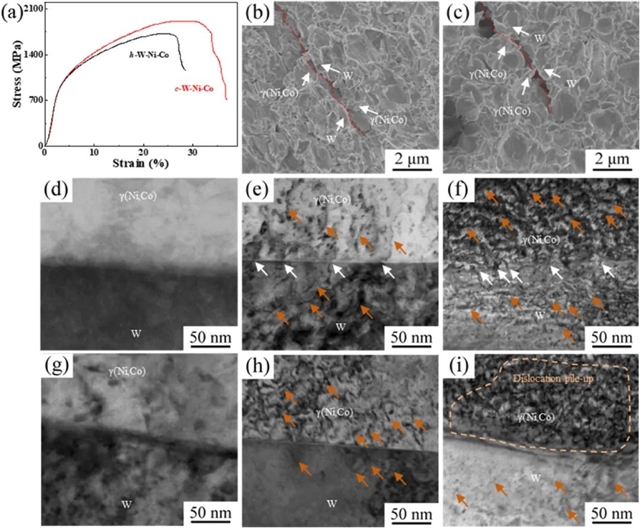 压缩性能分析表明,核壳结构粉体烧结合金屈服强度为847 MPa,极限抗压强度为1966 MPa,断裂应变达到 31%,均高于均匀结构粉体烧结得到的合金,证实其强度和塑性得到显著提升,且优于之前报道的大部分高比重合金。断口形貌分析可知两种样品中的裂纹扩展均主要沿钨-粘结相界面进行,这是由于相界面两侧成分和结构的不连续性所致。通过压缩变形过程中样品的 TEM 观察发现,共格界面有利于位错滑移穿过界面,减轻了由位错塞积引起的应力集中,因而有效抑制了潜在的裂纹形成。且共格界面较高界面结合强度显著增强了位错存储能力,从而展现出更为优异的力学性能。