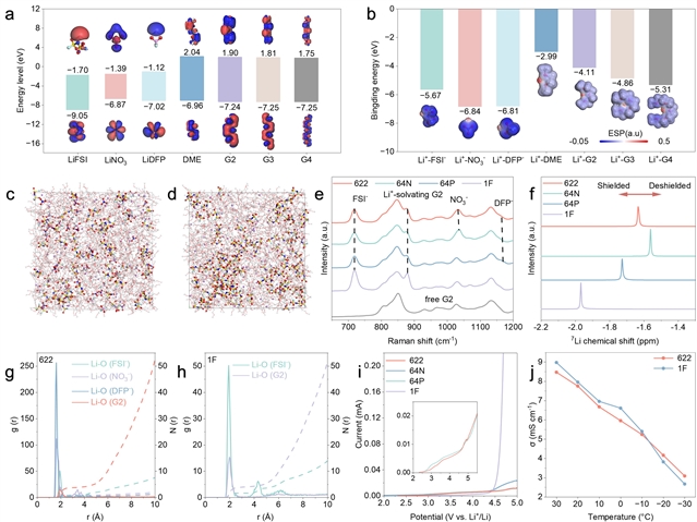 图1 不同电解液的理论计算和实验表征,(a)计算溶剂和锂盐的HOMO和LUMO,(b) Li+-溶剂/阴离子配合物的结合能和静电势,(c, g) 622和(d, h) 1F电解质的MD模拟轨迹、径向分布函数和配位数,(e)不同电解质的拉曼光谱和(f)7Li核磁共振光谱,(i) Li||Al电池在扫描速率为1 mV s−1时在不同电解质下的LSV结果,(j)不同电解液的离子电导率随温度变化,范围从- 30到30 °C。