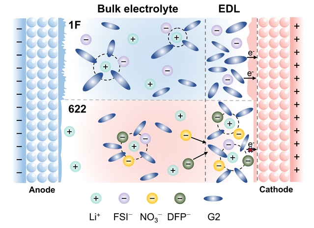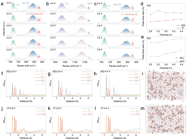 对电解液进行原位拉曼表征和计算模拟进一步验证双电层调控策略的有效性。如图2a-c所示,随着电压逐步升高,622组的NO3−和DFP−特征峰显著上升,而FSI-增幅相对较小,这是由于NO3−和DFP−两种阴离子的体积较小,电压响应更迅速,这进一步导致622组的与Li+结合的G2特征峰上升,游离态的G2特征峰下降,这是因为NO3−和DFP−的电负性更强,与Li+的结合能更高,从而可以吸引原本被高压正极排斥的Li+,这些Li+进而与自由溶剂结合,变成结合溶剂,最终提高了电解液的氧化稳定性。图2f-m对正极侧的双电层进行了计算模拟,与原位拉曼表征结果一样,随着电压升高,622组的NO3−和DFP−的概率密度上升,Li+与正极侧的距离相比1F组更近。