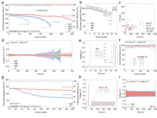 如图1a所示,HOMO和LUMO计算结果表明,G2的HOMO明显低于DME,且与G3和G4持平,表明G2溶剂的氧化稳定性更强。而图1b的结合能计算结果表明Li+与NO3−和DFP−的结合能显著大于与FSI-的结合能,而G3和G4的溶剂化能力过强,不适合作为单一溶剂使用。图1e的拉曼光谱和图1f的核磁共振光谱进一步印证了NO3−和DFP−进入内层溶剂化结构。此外Li||Al电池的LSV曲线表明622组分电解液的氧化稳定性显著强于1F组(图1i)。变温阻抗测试的结果则表明,得益于二氟磷酸锂的加入,622组在−30 °C下的离子电导率高于1F组(图1g)。
