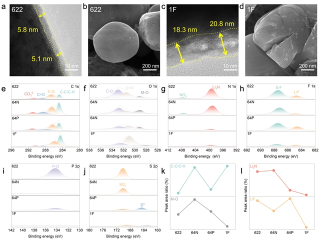 图4 NCM811正极与(a, b) 622和(c, d) 1F电解液循环100次的TEM和SEM图像,(e)不同电解质循环100次后NCM811阴极的C 1s, (f) O 1s, (g) N 1s, (h) F 1s, (i) P 2p和(j) S 2p XPS图谱,(k, l)基于XPS图谱的CEI成分分析。