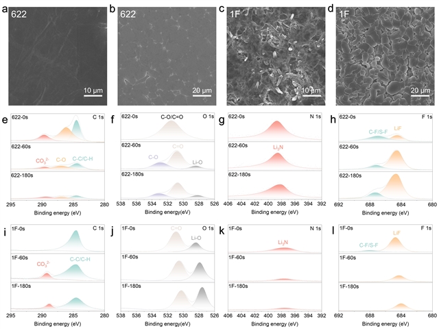图5 用(a) 622和(c) 1F电解液循环50次后,从Li||Li对称电池中回收的锂金属的SEM分析。(b, d)在不同电解质下,以0.5 mA cm−2沉积在Cu箔上的4.0 mAh cm−2锂的SEM图像。不同刻蚀时间下,锂金属负极在Li||Li对称电池中循环50次后的XPS (e, i) C 1s, (f, j) O 1s, (g, k) N 1s和(h, l) f 1s光谱的比较。