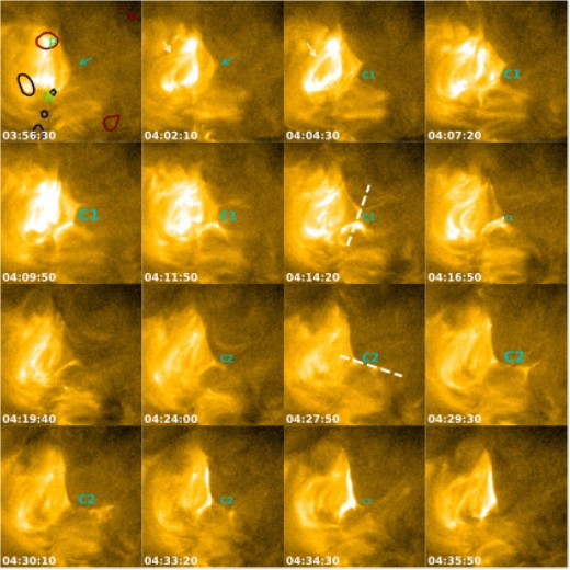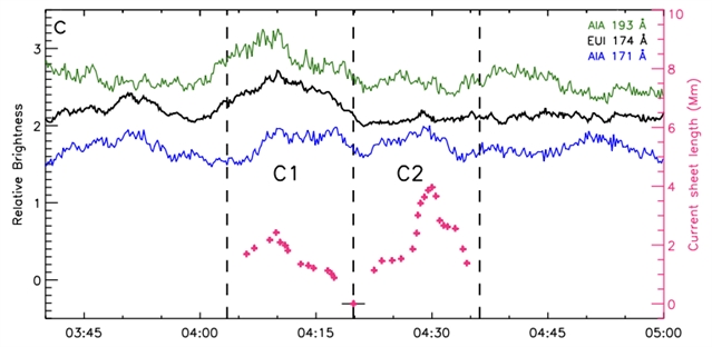 研究人员利用Solar Orbiter探测器2023年4月10日在距离太阳0.293AU处获取的极紫外成像数据,在太阳宁静区一个日冕亮点中识别出电流片演化过程的两个阶段——第一阶段,电流片C1沿某一方向发展,约10分钟内伸展至2.4Mm,后收缩至磁零点;第二阶段,约3分钟后,与C1垂直方向的C2电流片形成并延伸至4Mm,后逐渐消失。研究发现,两个阶段重联过程均伴随明显的等离子体流动和温度升高。同时,日冕亮点亮度与C1/C2长度变化高度一致,呈现约20分钟的衰减振荡,这表明磁能在周期性地向热能和动能转化,符合振荡磁重联典型表现。进一步,研究指出,持续的振荡重联或扮演“磁内燃机”角色,即通过不间断、节律性的磁能释放,在维持整体磁拓扑稳定的前提下,为亮点或其他小尺度结构持续供能并实现准周期性加热。