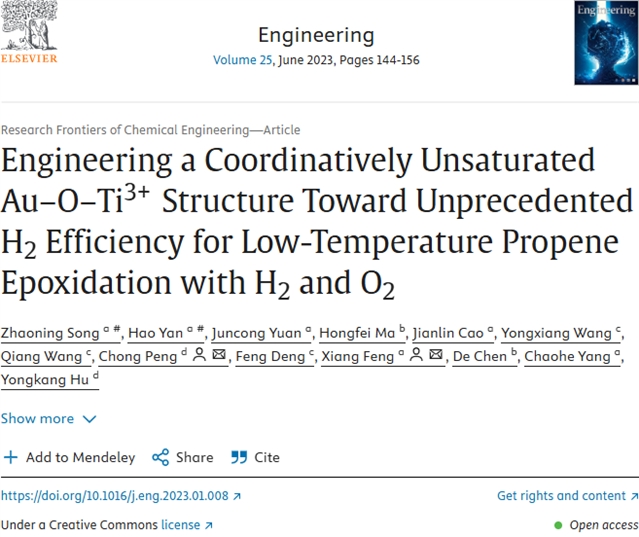 来自中国石油大学(华东)、挪威科技大学、中国科学院精密测量科学与技术创新研究院、大连理工大学等单位的科研团队,在中国工程院院刊《Engineering》发表题为 “Engineering a Coordinatively Unsaturated Au–O–Ti3+Structure Toward Unprecedented H2Efficiency for Low-Temperature Propene Epoxidation with H2and O2” (配位不饱和 Au–O–Ti3+活性位点的构建及其在低温丙烯气相环氧化反应中强化氢气效率的研究)的研究论文。论文共同第一作者为宋钊宁、闫昊,通讯作者为彭冲、冯翔。