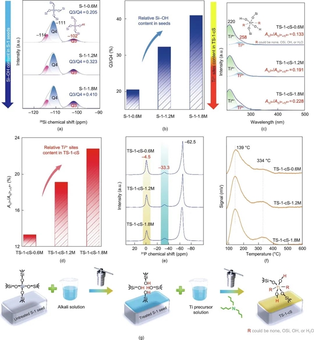 图 1. (a)不同浓度正丁胺处理后 S-1 晶种的29Si MAS NMR 谱图。(b)S-1 晶种中29Si MAS NMR 谱图中的相对 Q3/Q4 比。相应 TS-1-cS 的紫外可见光谱(c)、31P MAS NMR(d)和 NH3-TPD 谱图(e)。(f)TS-1-cS 载体紫外可见光谱中A(Ti3+)/A(Ti4++Ti3+)的相对比值。(g)TS-1-cS 合成机理示意图。