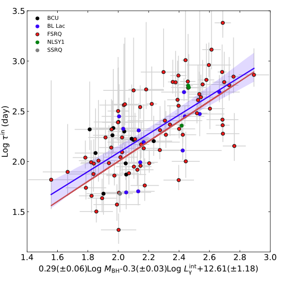 研究团队利用Zwicky瞬变设施(ZTF)提供的长期高质量光学观测数据,结合高斯过程(GP)中的阻尼随机游走(DRW)模型,对喷流AGN的光变曲线进行了更为精细的拟合。不同于以往的研究,团队采用目前最大规模的(具有伽马射线辐射的)喷流AGN样本,创新性地引入喷流功率(以伽马射线为表针)作为新参数,通过非参数的高斯回归方法进行分析(图1)。研究结果显示,单一的DRW模型并不能解释所有喷流AGN的光变行为,更为重要的是,发现了内秉光变特征时标、黑洞质量与喷流功率之间存在新的关系(图2),而这个关系在吸积有效和无效的喷流AGN中表现出明显的差异。