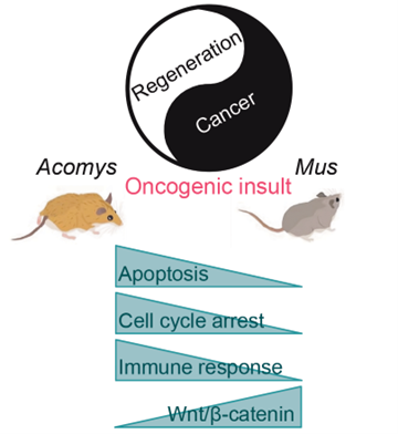 图示:非洲刺毛鼠的肿瘤抗性是通过增强对致癌刺激的免疫反应、更高的凋亡率、细胞周期停滞以及Wnt/β-连环蛋白信号通路的抑制来介导的。