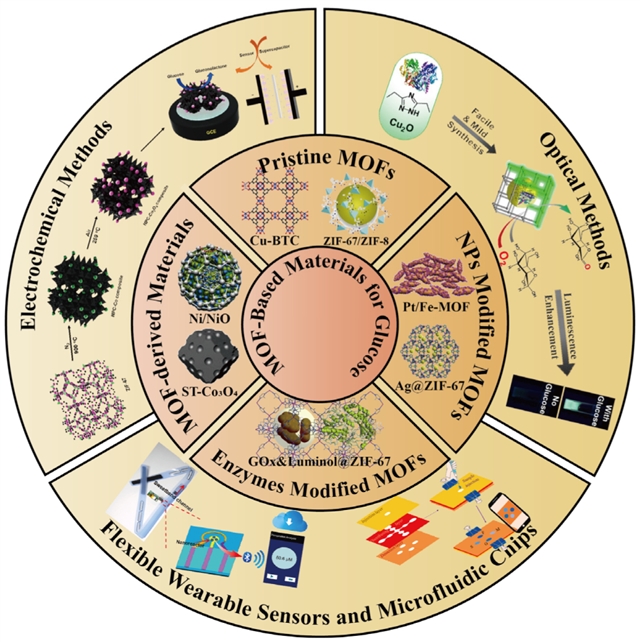 葡萄糖在人体生命活动中扮演着不可或缺的角色,其不仅为机体提供能量,还通过调节细胞内葡萄糖水平来控制细胞活动。在医学领域,葡萄糖检测对于糖尿病等疾病的诊断和管理至关重要。糖尿病作为全球常见且快速增长的疾病之一,主要特征为高血糖水平,而准确、灵敏、即时的葡萄糖检测有助于患者有效管理血糖水平,预防并发症的发生。金属有机框架 (MOF) 材料因其可调节的孔隙、多样的功能位点、稳定的结构和多功能性,在葡萄糖检测中发挥着重要作用,成为当前研究的热点之一。