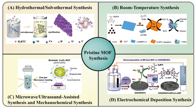 (1) 原始MOF的合成:原始MOF材料因其内在的氧化还原性质,在非酶促血糖检测中得到广泛应用。这些材料通常通过溶剂热或水热法合成,涉及金属盐与有机配体在高温高压条件下的反应。原始MOF材料的电化学性能使其在电化学检测中表现出色,能够作为葡萄糖氧化的催化剂 (图1)。