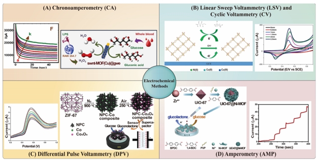 (1) 电化学方法:电化学方法基于MOF或修饰材料的氧化还原反应,包括计时安培法 (CA)、线性扫描伏安法 (LSV)、循环伏安法 (CV)、差分脉冲伏安法 (DPV) 和安培法 (AMP)。这些方法因其高灵敏度、低成本和操作简便而在血糖检测中得到广泛应用 (图2)。